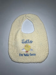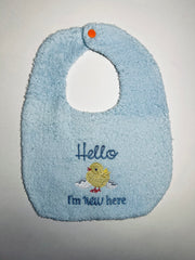 Reversible bibs with terry cloth/flannel. Baby chick came out of the egg with the saying "Hello I'm new here."