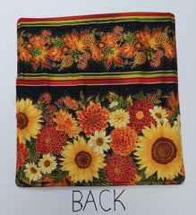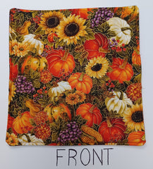Different color pumpkins, sunflowers, and sunflowers with fall stripes.